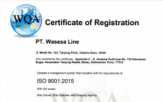 Ship Owner, Ship Operator & Shipping Agency QHSE Kebijakan MutuSertifikasiPenghargaan Sertifikat ISO PT. Wasesa Line ISO 9001-2015 Certificate DOWNLOAD ISO 14001-2015 Certificate DOWNLOAD ISO 45001-2018 Certificate DOWNLOAD